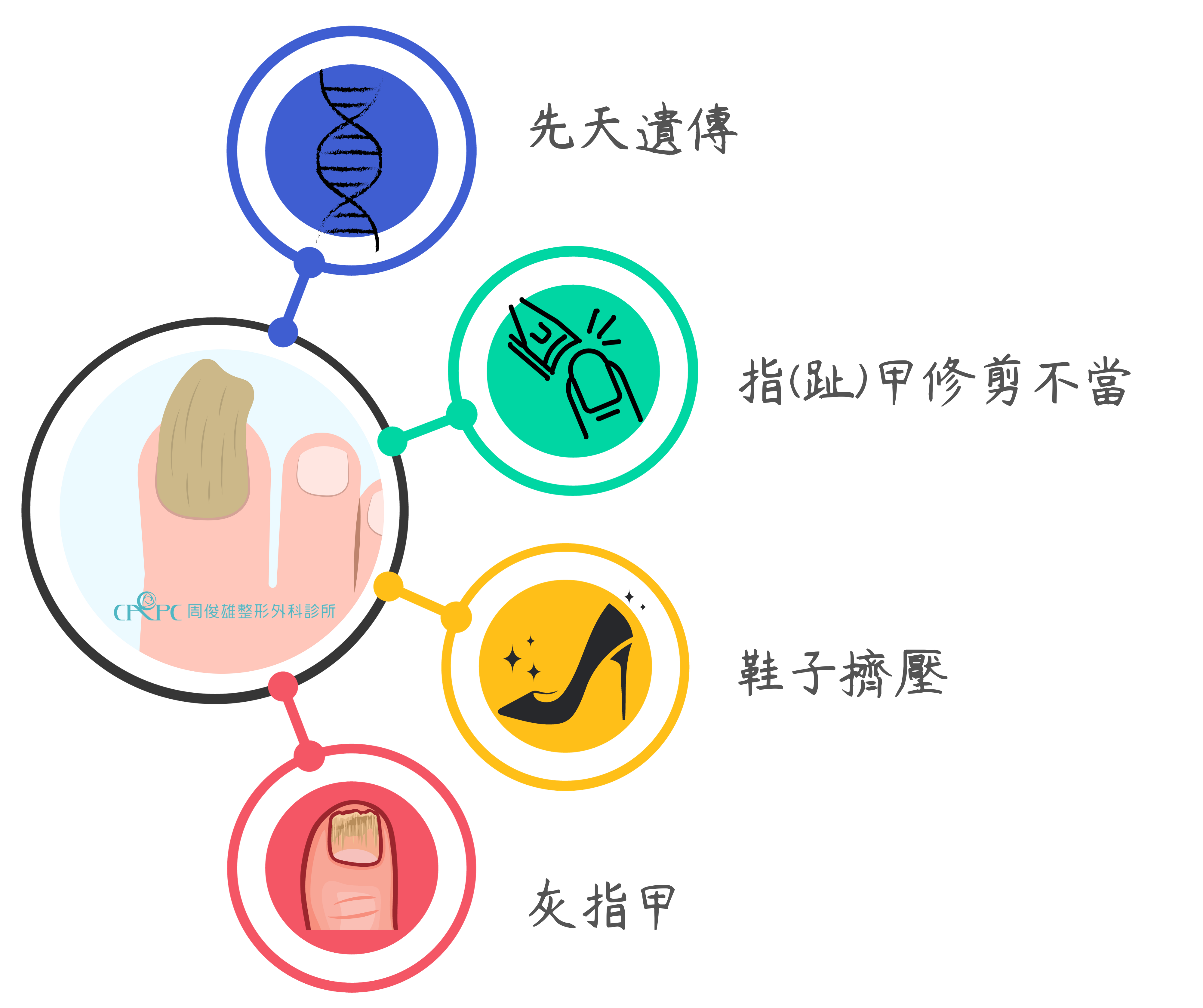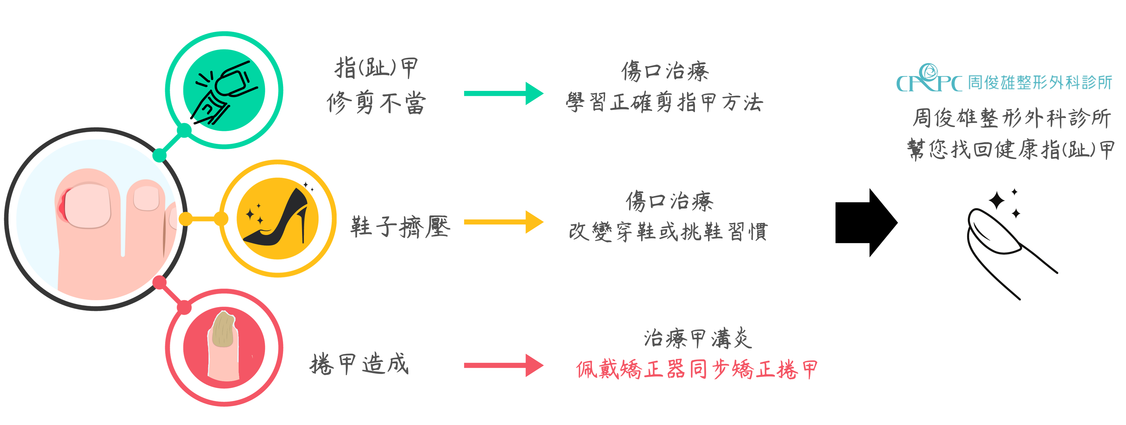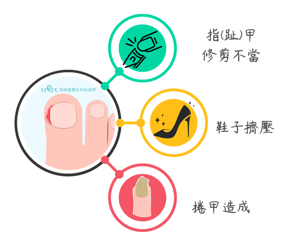 1. 趾(指)甲旁邊皮膚有微型或明顯傷口遭受感染。