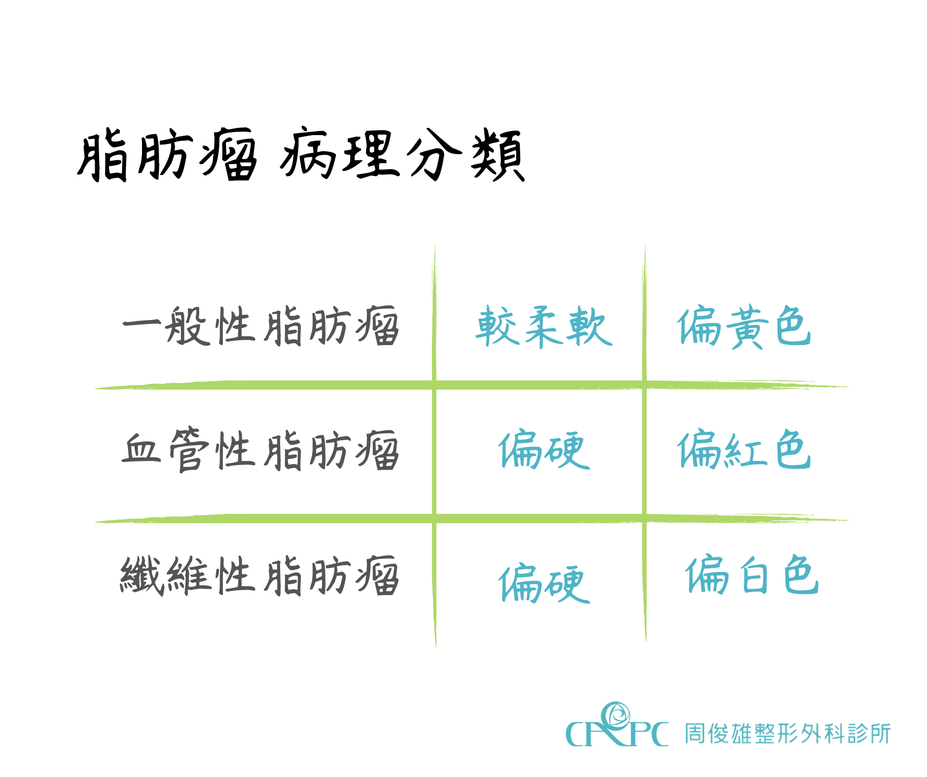 化驗後若確定為脂肪瘤,病理可分為三類:一般性、血管性、纖維性,從外觀、觸感有所區別。不過三者皆屬於脂肪瘤,開刀可切除乾淨,並無大礙。周俊雄整形外科診所的醫師具豐富手術經驗,手術切口及傷口縫合精細也是術後恢復、疤痕照顧的重要因素之一,交給我們的專業團隊,讓您安心且放心。