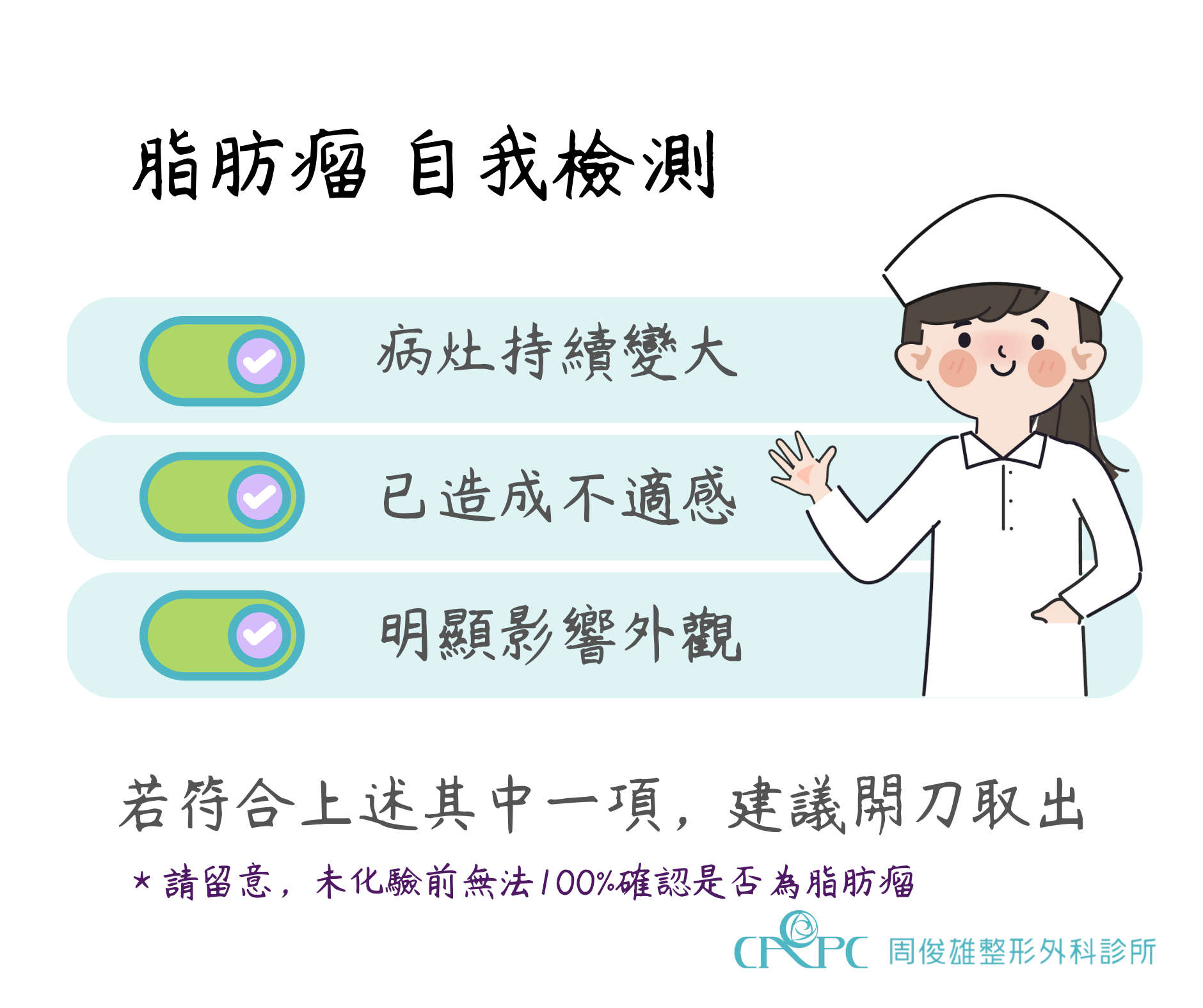 當您發現自己好像長脂肪瘤,可先觀察1.病灶是否快速變大2.是否造成不適感,例如壓迫到神經造成疼痛等3.明顯影響外觀,若符合以上一項,建議就醫並開刀取出。請注意,未化驗前無法證明是否100%為脂肪瘤。