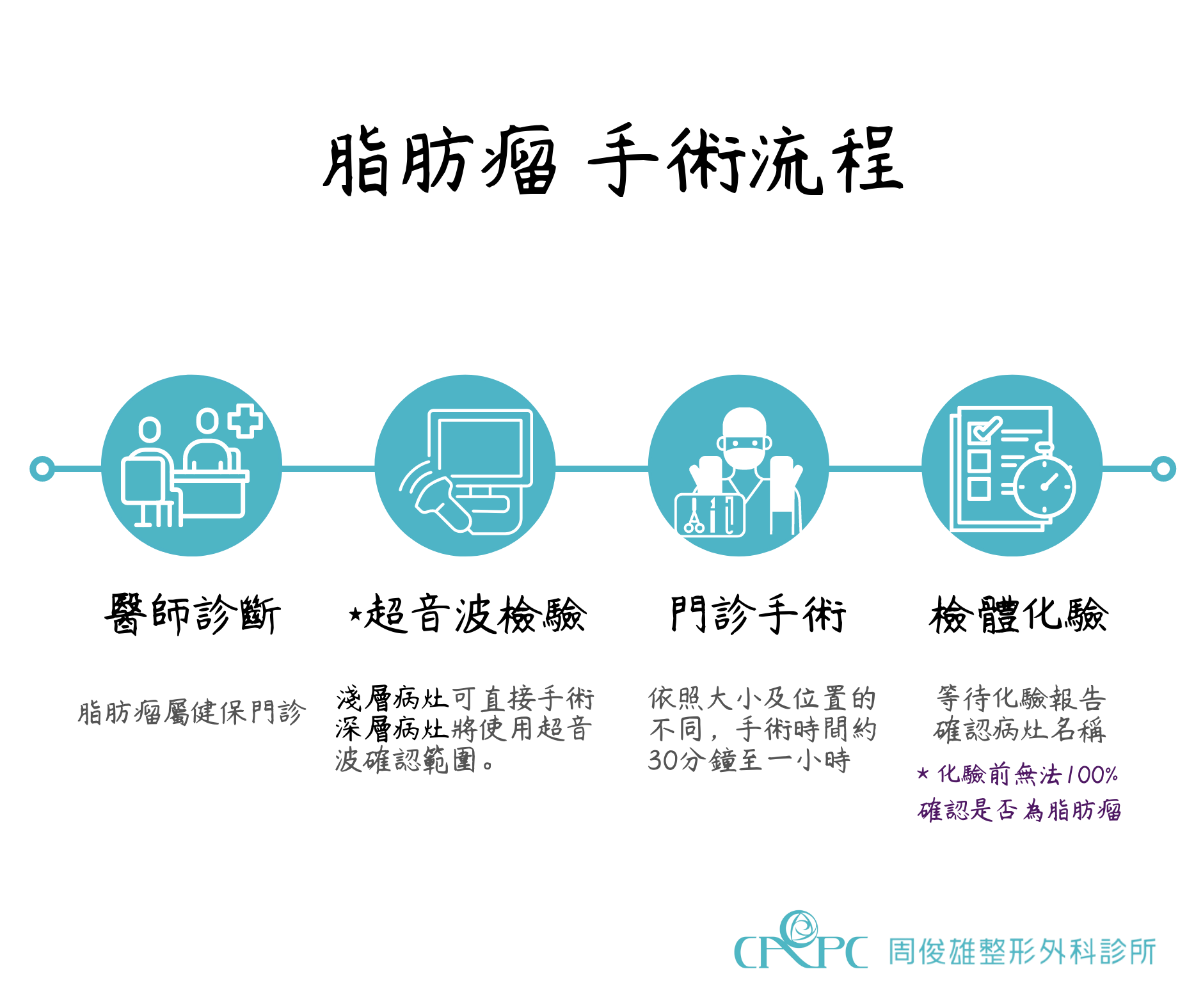 一般脂肪瘤為門診手術,手術時間約30分鐘至一小時,依照大小、深淺而不同。經過醫師看診後,較淺層的病灶可直切除;若是較為深層的病灶,會先使用超音波檢驗其範圍,大多數情況門診可直接手術;若範圍太廣或太深層,建議至大醫院處理。切除後將送檢體化驗,確認病灶名稱,再次提醒,化驗前無法100%確認是否為脂肪瘤。